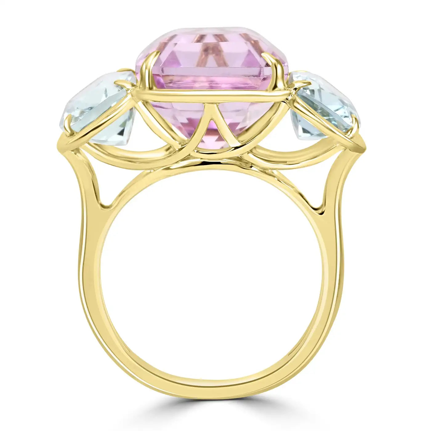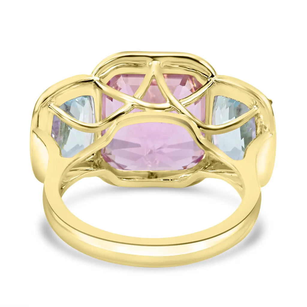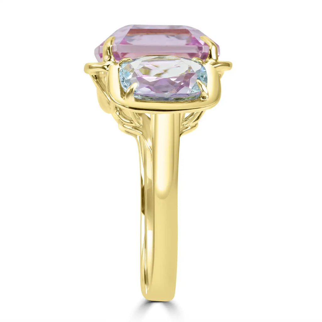 Anillo de oro de 14 quilates con bisel de tres piedras y aguamarina de talla esmeralda Kunzita