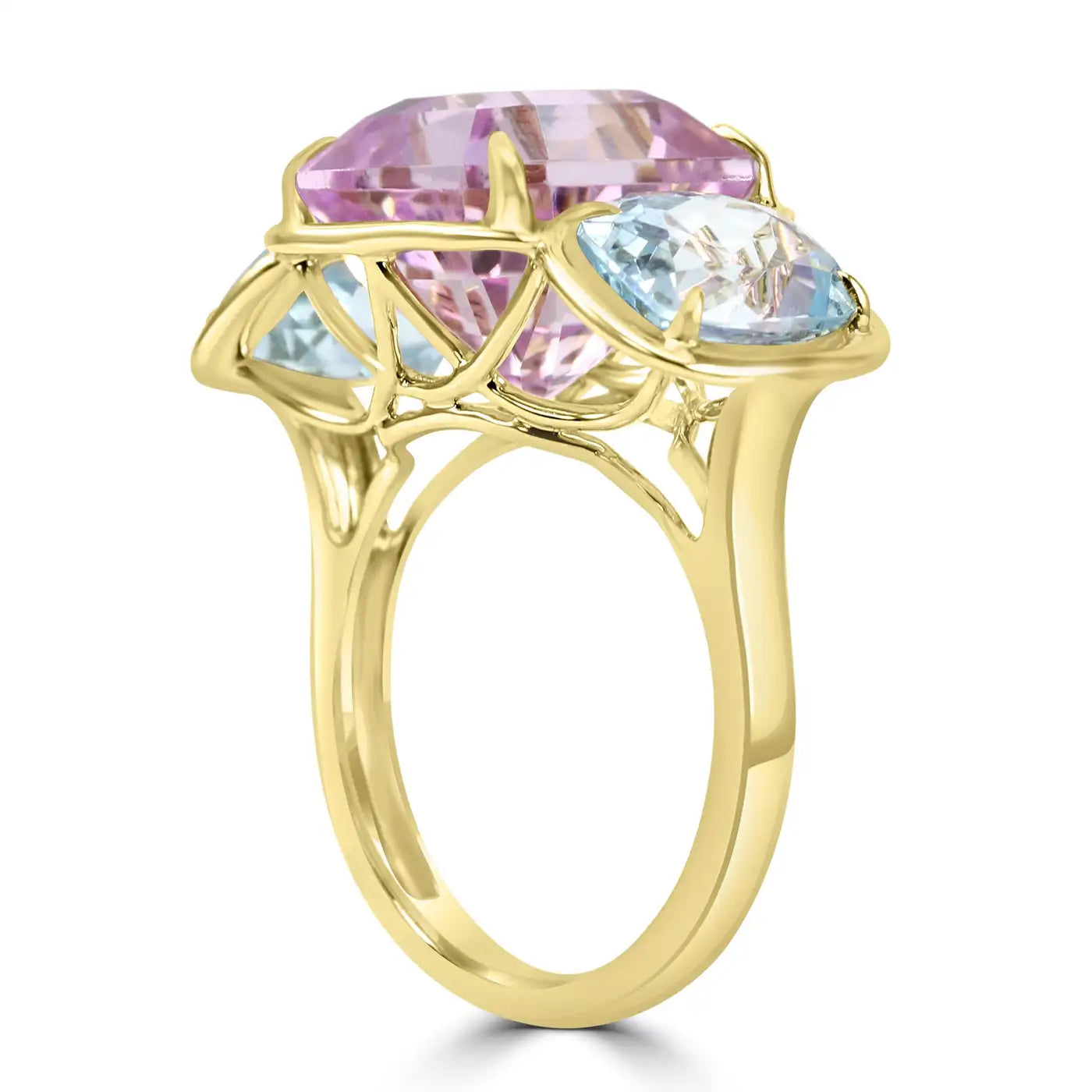 A cada lado de la kunzita hay dos aguamarinas, con un peso total de 4,16 quilates. Los tonos azules serenos de las aguamarinas complementan maravillosamente el tono violáceo de la kunzita, creando una mezcla armoniosa de estos dos colores que es a la vez llamativa y encantadora.