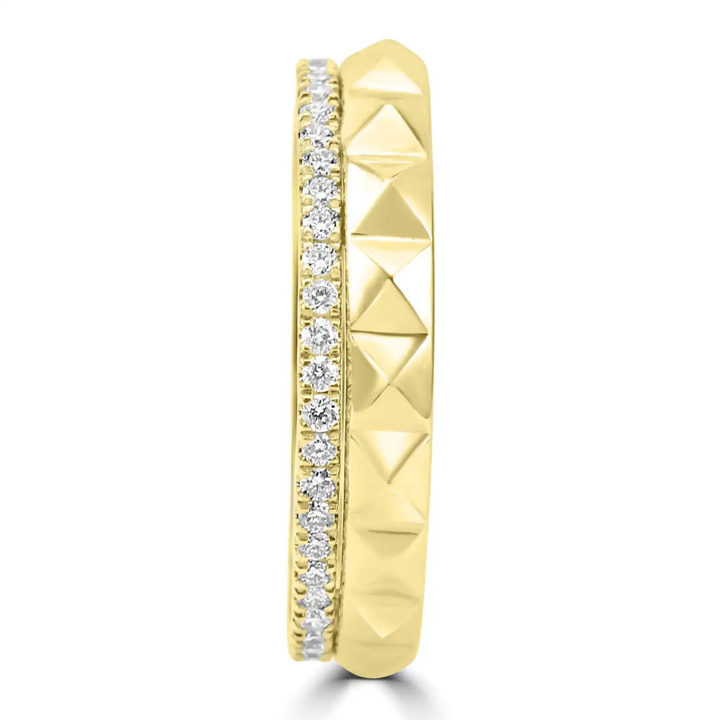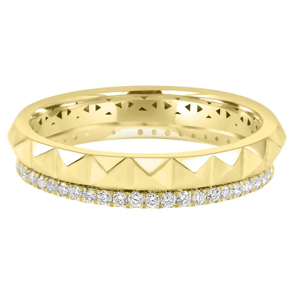 El brillo cálido y radiante del engaste de oro amarillo de 14 quilates proporciona un lujoso telón de fondo para los diamantes, realzando su brillo y creando una combinación armoniosa de estética clásica y moderna. El diseño elegante y suave de la banda garantiza un ajuste cómodo, lo que la convierte en una opción ideal para el uso diario o como pieza para ocasiones especiales.